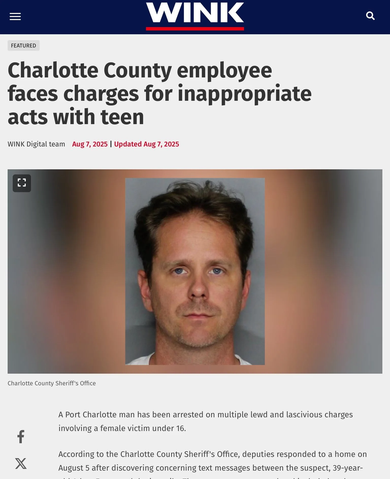 According to the Charlotte County Sheriff's Office, deputies responded to a home on August 5 after discovering concerning text messages between the suspect, 39-year-old Adam Franz, and the juvenile. The messages were sexual and included nude photographs of the victim.